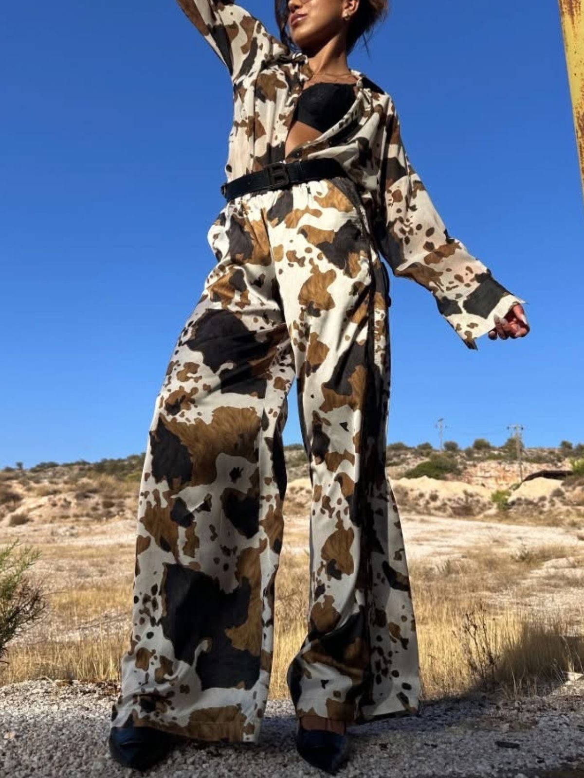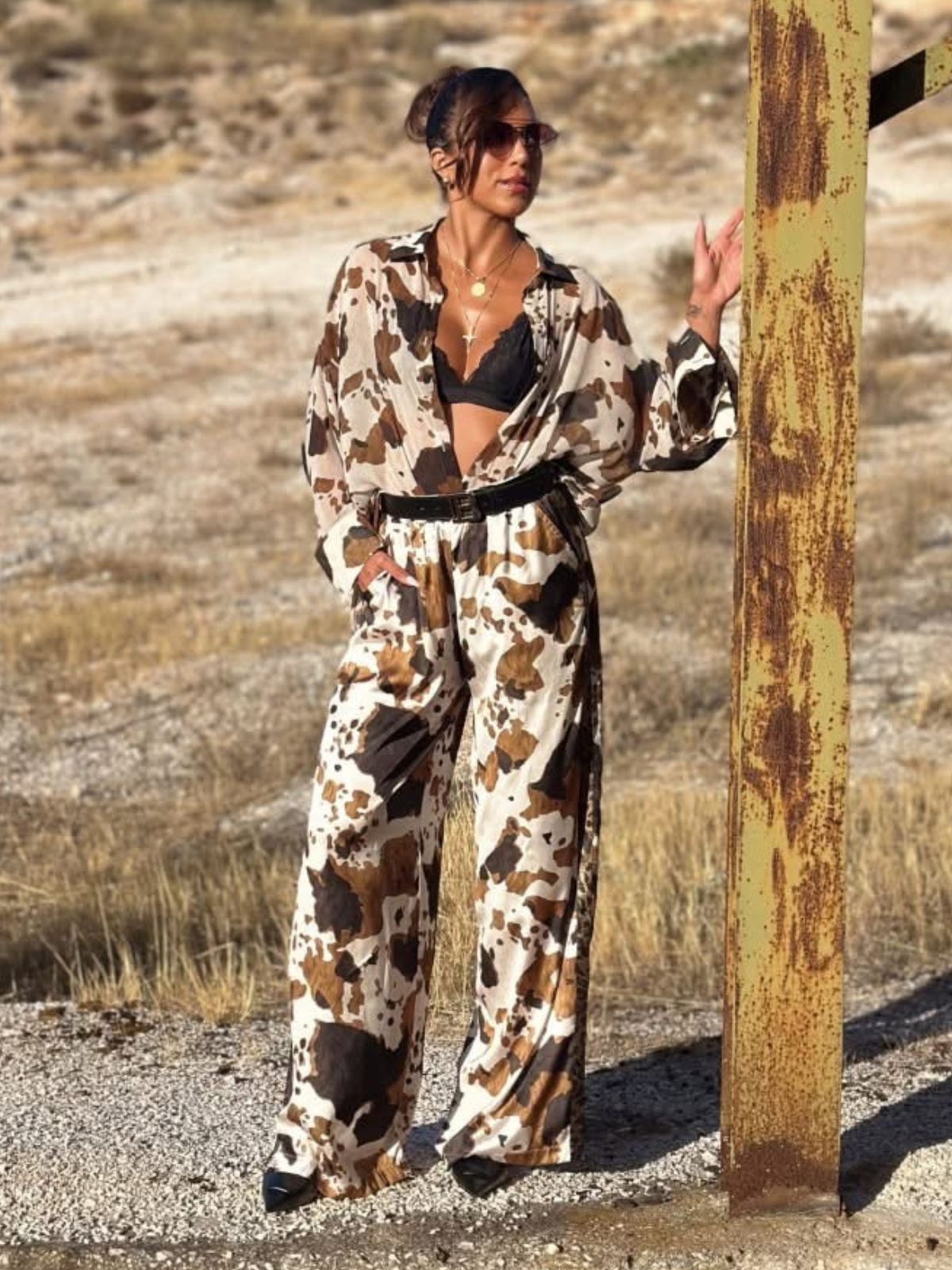 •Το printed σατέν παντελόνι με τρέσα είναι το απόλυτο item που θα απογειώσει κάθε καθημερινό look. Ελαφρύ και δροσερό, με relaxed γραμμή και λάστιχο στη μέση για άνετη εφαρμογή. Ιδανικό για να φορεθεί με sneakers, σανδάλια ή γόβες. Ταιριάζει τέλεια με το ασορτί πουκάμισο ή με μονόχρωμα tops για πιο ισορροπημένο στυλ.
